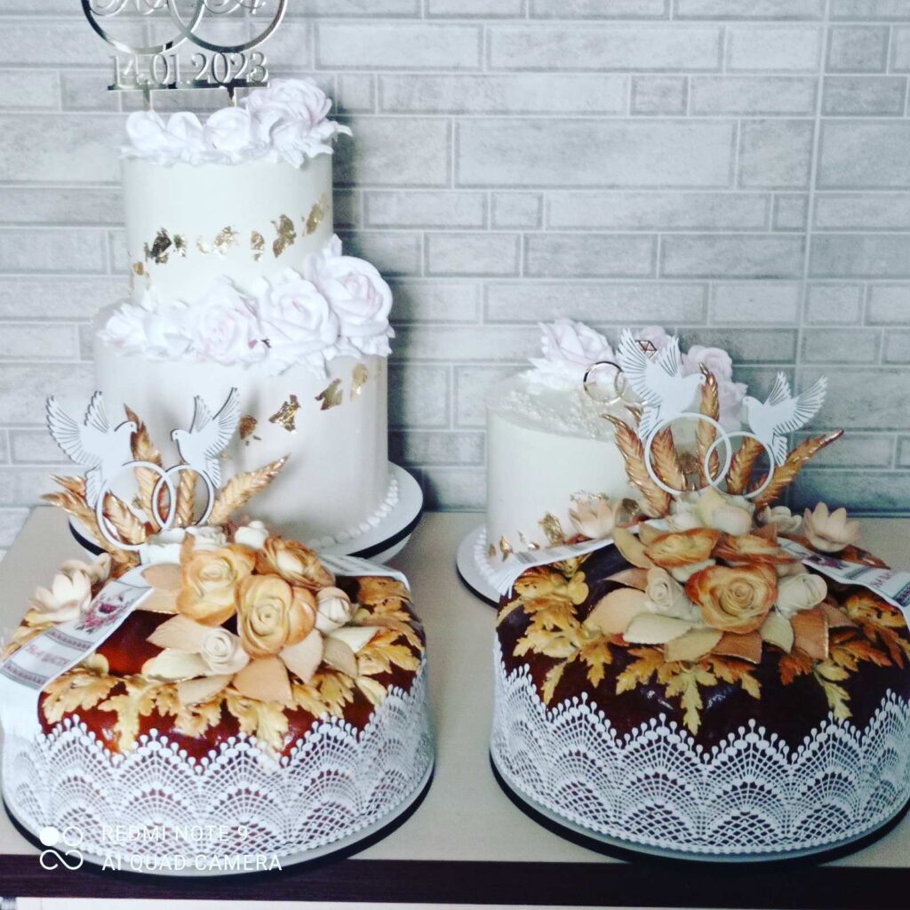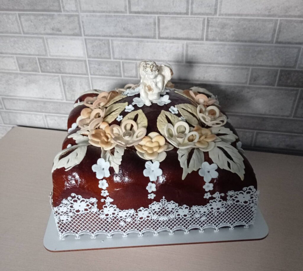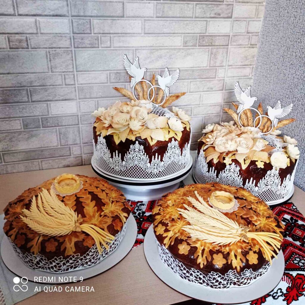 У переддень випічки майстриня власноруч із прісного тіста готує прикраси – троянди, маки, колоски, листочки, лебеді, обручки.