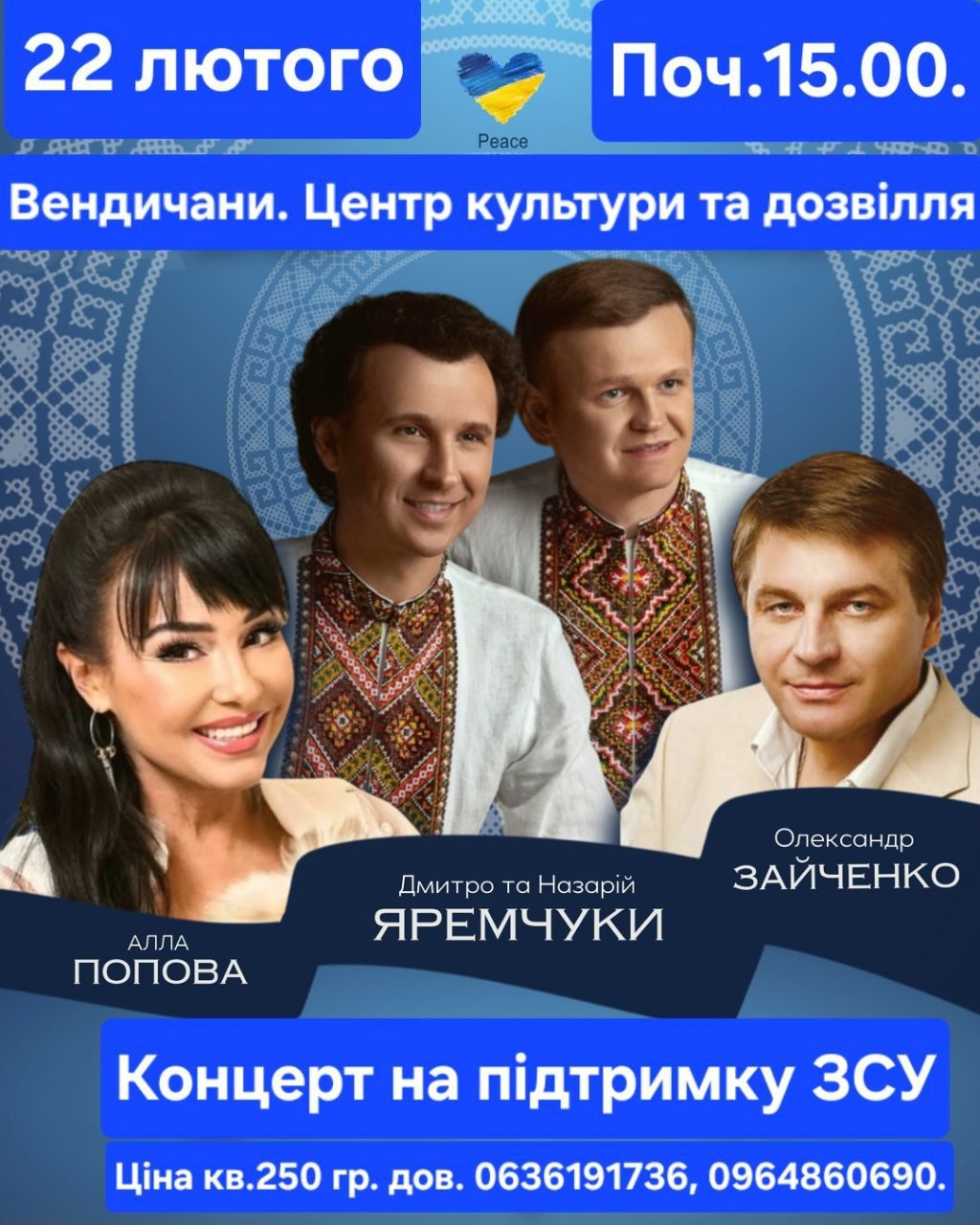 Благодійний тур «Україна переможе, а українська пісня допоможе» завітає до Вендичанської громади 22 лютого. Перед мешканцями та гостями громади виступлять народні артисти України Дмитро та Назарій Яремчуки, народна артистка України Алла Попова та заслужений артист України Олександр Зайченко.
